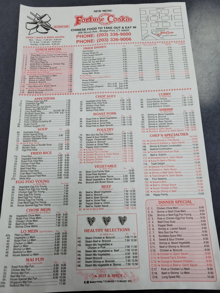 Welcome to Fortune Cookie Chinese Kitchen, a hidden gem in Bridgeport, CT, where authentic Chinese flavors and delightful experiences await. Nestled at 306 Wood Ave, this unclaimed establishment impresses with its classy ambience, outdoor seating, and options for takeout. Diners can enjoy a diverse menu featuring classics like Egg Foo Young and a variety of chicken dishes, such as Chicken W. Broccoli and Pineapple Chicken, all generously priced, making it an affordable choice for food lovers.